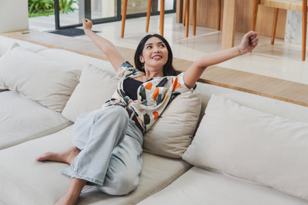 Pretty young Asian woman is sitting on a couch with her arms raised in the air, feeling happy and enjoying holiday.