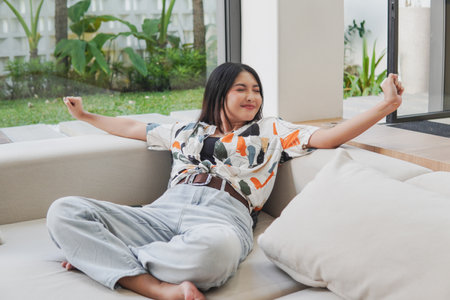 Joyful Asian woman is laying on a couch in a vacation villa with smile on her face and relief expression.