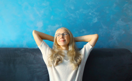 Relaxed caucasian middle-aged woman resting with folded hands behind the head in eyeglasses while sitting on the couch in room at home