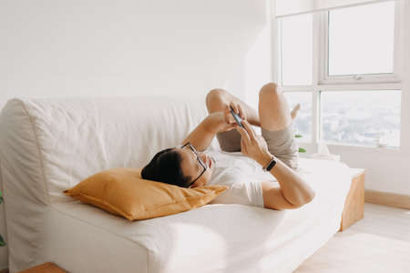 asian male teenager man listening to music from smart mobile phone while lying on floor at home