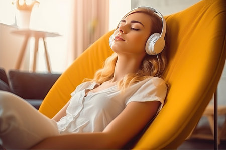 A young woman relaxing on a cozy sofa while listening to music in a sunlit living room
