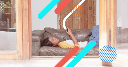 Reclining Chinese woman holding phone overhead at home on brown leather sofa with graphic overlays. Relaxation, cozy, rustic, wooden, plant, window, diagonal