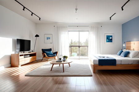 Cinematic Scandinavian room, clean lines, symmetry, balance, filmic light, minimalist style, visual clarity.