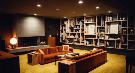Bedroom decor, home interior design . Industrial Mid-Century Modern style with Bookshelf decorated with Concrete and Wood material . Generative AI AIG26.