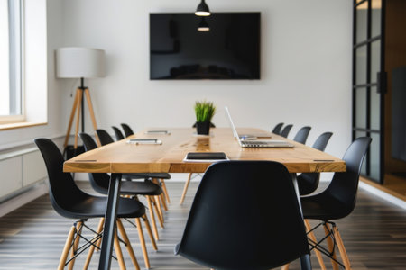 Bright and modern conference room featuring a large table, chairs, and plenty of natural light. Ideal setting for meetings, presentations, and teamwork.