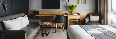 Interior of hotel room with sofa and armchairs. 3D rendering