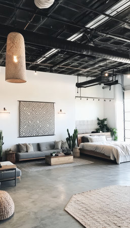 Stylish industrial bedroom featuring concrete floors, gray sofas, and geometric wall art decor