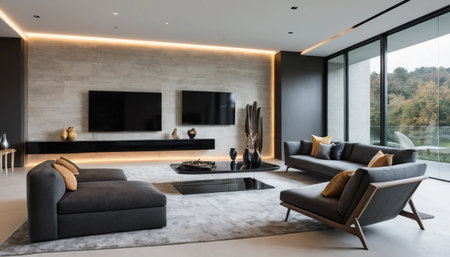 Living room decor, home interior design . Modern Minimalist style with Large Window decorated with Leather and Glass material . Generative AI AIG26.