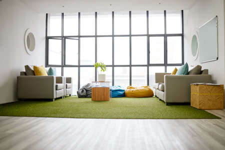 A modern open-plan office a bright yellow sofa, wooden table, chairs, plants, and abstract wall