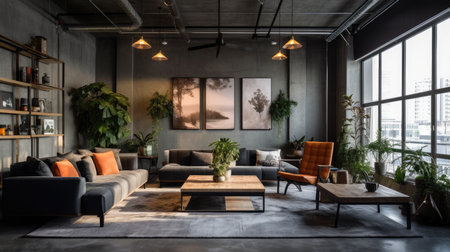 Living room decor, home interior design . Contemporary Industrial style with Large Windows decorated with Concrete and Leather material . Generative AI AIG26.