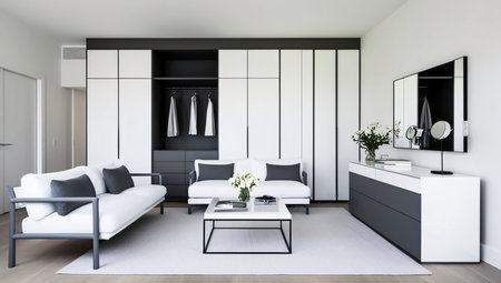 Design a minimalist dressing room sleek built-in wardrobes, and open shelving. Incorporate a large, frameless mirror and a simple, neutral-toned rug.