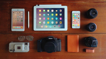 This image showcases a well-arranged collection of modern technology and photography equipment on a wooden surface, ideal for creatives and enthusiasts.