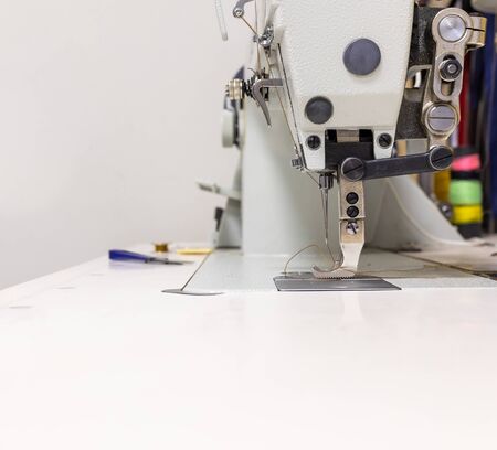 Industrial flat-seam sewing machine. Close-up. Soft focus