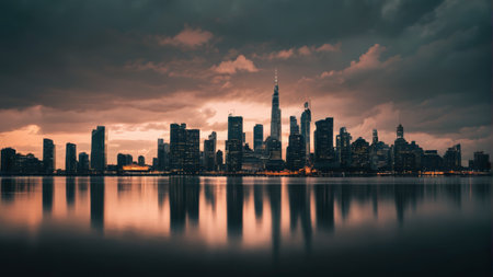 Illuminated skyscrapers dominate the cityscape, casting a warm glow against the serene waters at dawn. Ai generated image