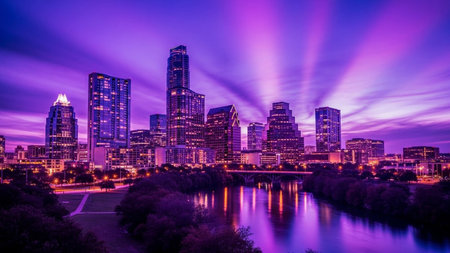 A view of the Austin, Texas skyline at twilight. The sky is a deep, vibrant purple, illuminated by the fading light and streaks of light trails. The city's modern skyscrapers and buildings are lit up, casting a warm glow. A river in the foreground reflects the city lights and the dramatic sky, with abstract light patterns creating a sense of movement and energy. Trees line the riverbank, adding a touch of nature to the urban landscape. The overall mood is dramatic, vibrant, and atmospheric.