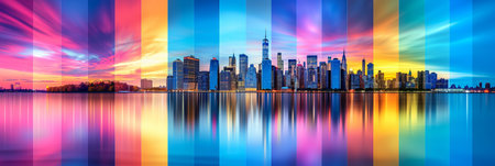 A panorama image of the New York City skyline at sunset, showing a variety of hues across the sky, from deep blues to vibrant oranges and reds. The citys iconic skyscrapers are silhouetted against the colorful sky, and the water reflects the sunsets colors. A small boat is seen in the foreground, adding to the picturesque scene.