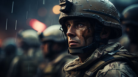 Captivating image of a soldier in combat gear showcasing focus and readiness, standing alongside team members in a military environment, symbolizing strength and teamwork.