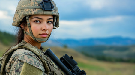 A female soldier in full combat gear with a rifle stands in a scenic outdoor landscape, showing strength and readiness.