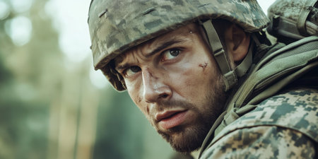 Intense Soldier Portrait in Camouflage Gear During Outdoor Operation.