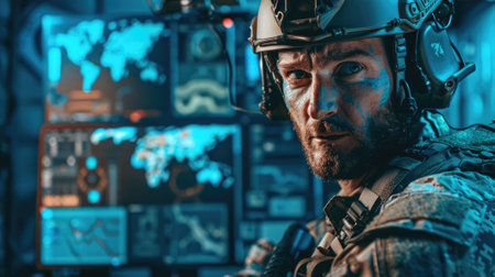 The close up picture of the military officer is working on the operation in the warfare or battlefield, the military require skill like endurance, training, physical strength and combat skill. AIG43.