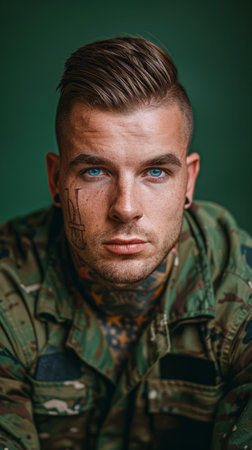 Confident Young Man with Tattoos Posing in Military Camouflage Jacket on Green Background AI Generative