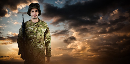 Portrait of soldier with rifle against blue and orange sky with clouds
