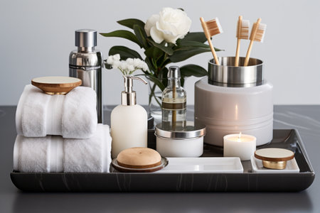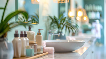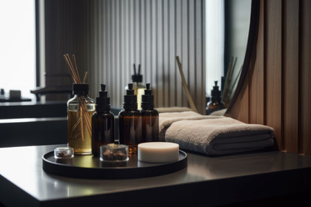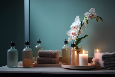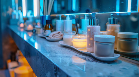 A close-up of a luxurious bathroom counter adorned with spa essentials like candles, lotions, and bottles in soft, warm lighting. Reflective surfaces and serene ambiance create a calming, relaxing atmosphere.