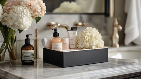 A gift box filled with luxurious bath products, placed on a marble bathroom counter.