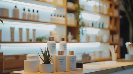 A stylish display of cosmetic products in a modern spa setting with illuminated shelves.