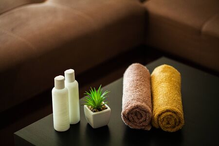 Towels bottle liquid vase flowers table beige cream natural tones small wellness relaxation pool
