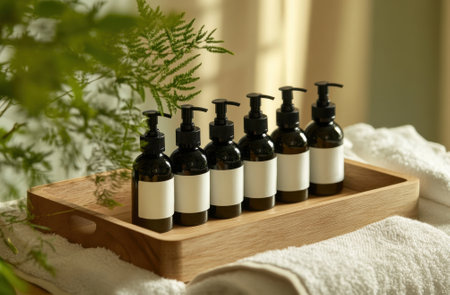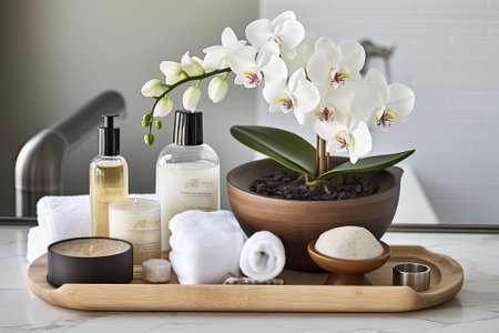 Clean, luxurious bathroom setup with spa tray, organic lotions, and potted plant