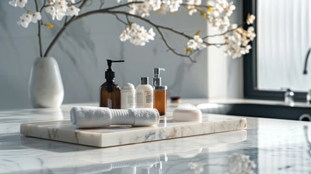 A modern bathroom countertop with luxurious bathroom supplies, including scented candles, soap dispensers, and hand lotion.