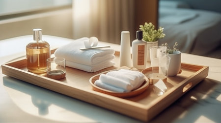 Set of spa products on wooden tray in hotel room, copy space
