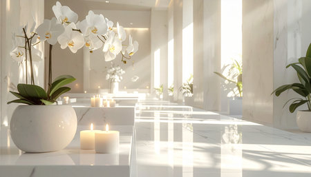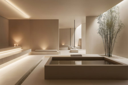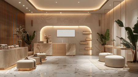Discover an elegant modern spa interior featuring minimalist design, soft lighting, and lush greenery. Ideal for concepts of relaxation and wellness.