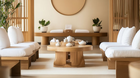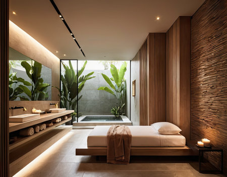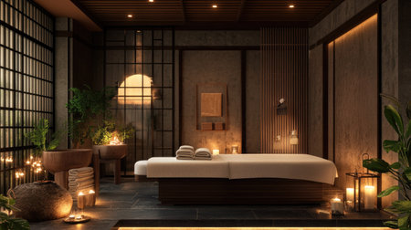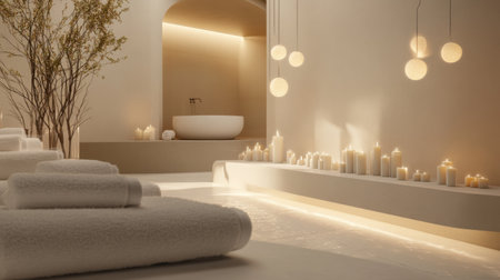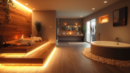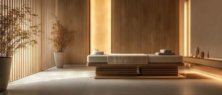 Warm, inviting spa sanctuary promoting tranquility and relaxation through minimalist design, natural materials, and soft lighting