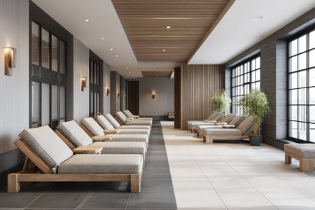 This interior showcases a spa environment with several lounge chairs. The scene features neutral tones and wooden accents. Natural light streams through large windows, enhancing the calming ambiance. This image can be used for promoting wellness, health services, or illustrating interior design concepts. It is suitable for various editorial and commercial applications.