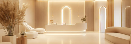 A spacious reception area features a sleek desk, comfortable seating, and soft ambient lighting, creating a calming atmosphere.