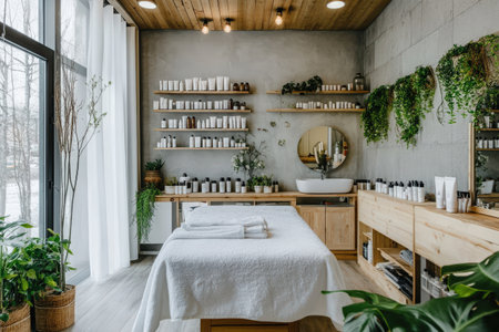 Shelves with organic spa products, woven baskets, and potted plants in a tranquil, modern interior