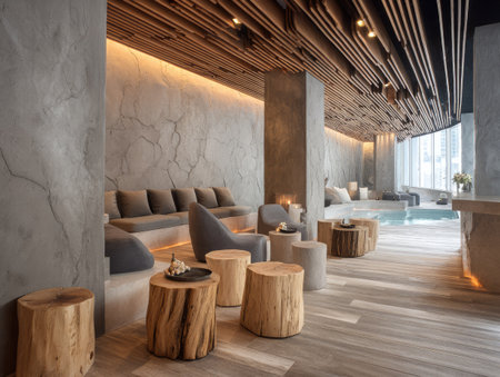This image showcases a modern spa interior with a focus on natural materials. The scene features wooden stools, a textured ceiling design, and a comfortable seating arrangement. The color palette incorporates neutral tones with warm lighting, suggesting a relaxing environment suitable for wellness concepts and commercial applications.