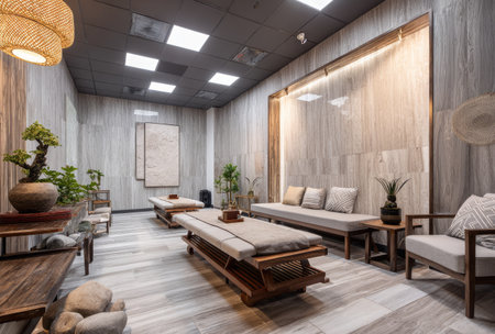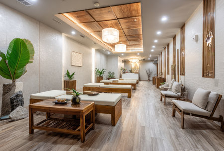An inviting spa interior presents massage tables, comfortable seating, and decor. The scene is illuminated by overhead lighting, casting soft shadows across the wood and textured walls. The design incorporates natural elements suggesting a serene and restorative environment. Suitable for wellness, healthcare, and lifestyle publications.