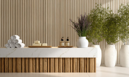 An interior spa scene displays a counter with stacked towels, soaps, and bottles. Decorative plants, including lavender and greenery, are in vases. The color palette emphasizes neutral tones with wood and marble textures. This image could be suitable for lifestyle and wellness related commercial projects.