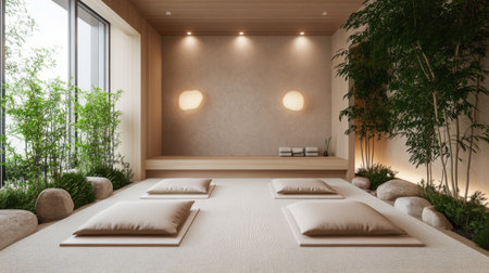 This serene minimalist zen space showcases natural elements and soft lighting, creating a perfect environment for meditation and relaxation practices.