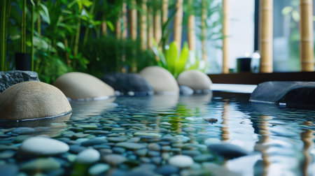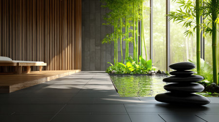 This interior scene showcases a spa-like environment, featuring stacked stones, lush bamboo, and a tranquil water element. The color palette emphasizes natural tones with wood and greenery accents. The composition suggests a serene atmosphere, potentially suitable for wellness, relaxation, or meditation-themed projects, and commercial usage.
