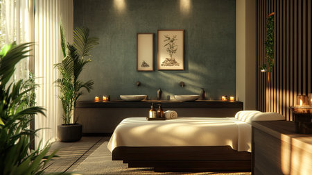 Luxurious spa treatment room, relaxing atmosphere, natural light, peaceful background, wellness