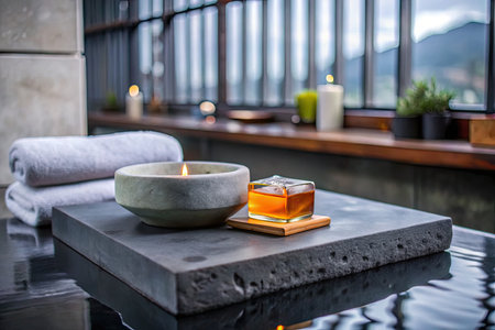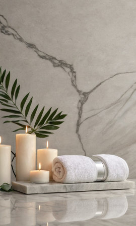 Spa and wellness setting with candles and towels on black marble table