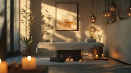 A serene spa massage room illuminated by soft natural light, creating a peaceful ambiance for relaxation
