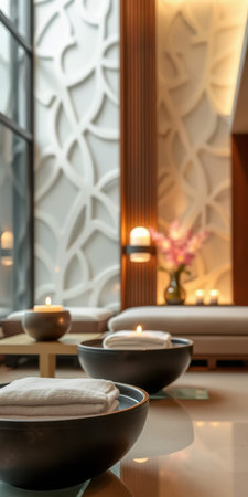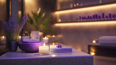 Experience a peaceful spa atmosphere featuring candles, lavender, and elegant decor. Ideal for promoting relaxation, wellness, and self-care in a tranquil setting.