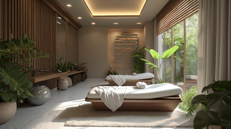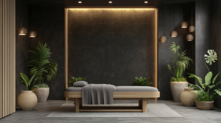 Modern spa room with wooden elements and indoor plants.