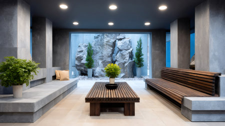 Tranquil spa waiting room boasting sleek wooden furniture, stone walls, and a rock garden, creating a serene atmosphere