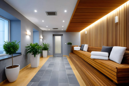 Minimalist spa lounge with wooden slatted walls, ambient lighting, and potted plants creating a relaxing atmosphere